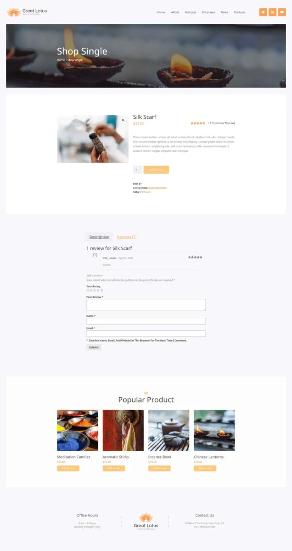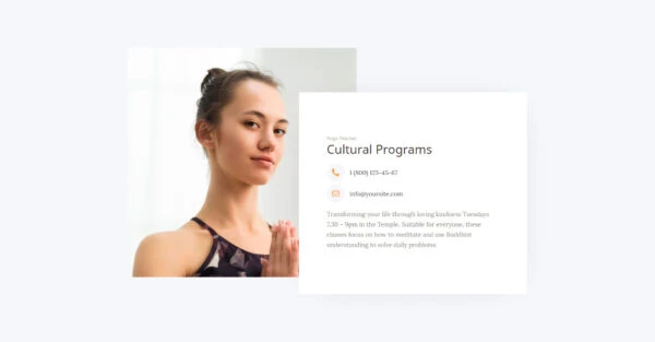 Discover our Buddhist temple website template, designed specifically for Elementor. This elegant and soothing design allows you to showcase your temple, activities, and spiritual values ​​in an engaging way. Thanks to an intuitive interface, you can easily customize each section to your needs. This template is fully compatible with the latest versions of Elementor, WordPress, and WooCommerce, ensuring a seamless experience, whether you want to share information or sell products online. Offer your community a digital space that reflects the serenity and beauty of your temple.