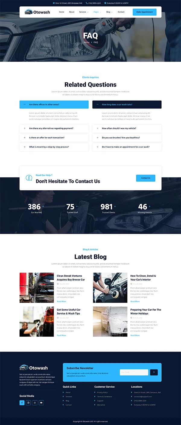 Give your car wash business an attractive online storefront with our Elementor template. Designed to captivate your customers, this sleek and modern template will allow you to showcase your services in a clear and professional manner. Thanks to its compatibility with WordPress and WooCommerce, you can easily manage your bookings and online sales. Take advantage of customizable sections to highlight your services, prices, and customer reviews, while optimizing your SEO. Simplify your website creation and attract more customers with this intuitive and powerful template.