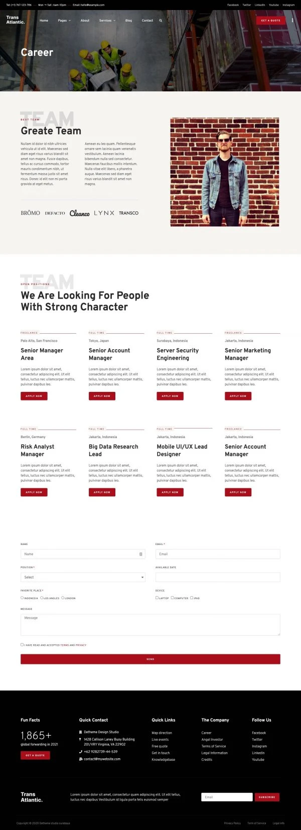 Discover our website template designed specifically for the transport logistics industry. With a modern and intuitive design, this Elementor template allows you to create an attractive and functional website in no time. It is fully customizable, giving you the freedom to adapt colors, fonts, and layouts to your needs.