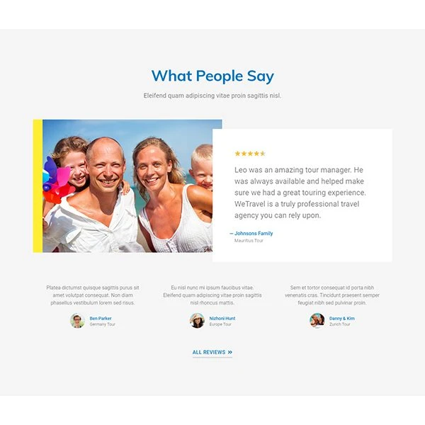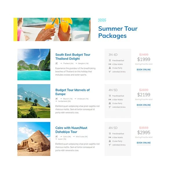 Transform your travel agency with our website template specifically designed for Elementor. This sleek and modern template allows you to create an attractive showcase for your travel offerings, while providing a seamless user experience. Thanks to its compatibility with the latest versions of Elementor, WordPress, and WooCommerce, you can easily customize each section to your needs. Entice your customers with captivating visuals and intuitive features to book their next adventures. Stand out in the travel market with a website that inspires confidence and makes you want to explore.